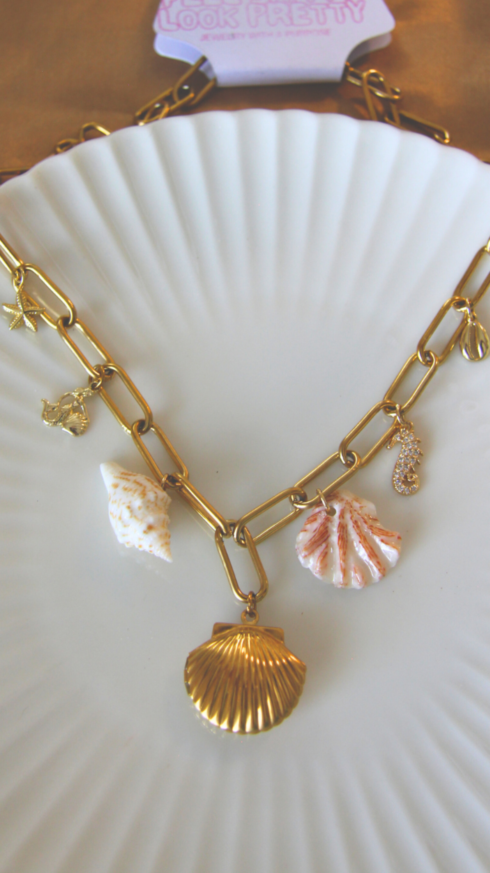 Genuine shells, 18k PVD plated charms and chain. Water and tarnish proof. Starfish, cowrie shell, mermaid, seahorse, and scallop shell charms.