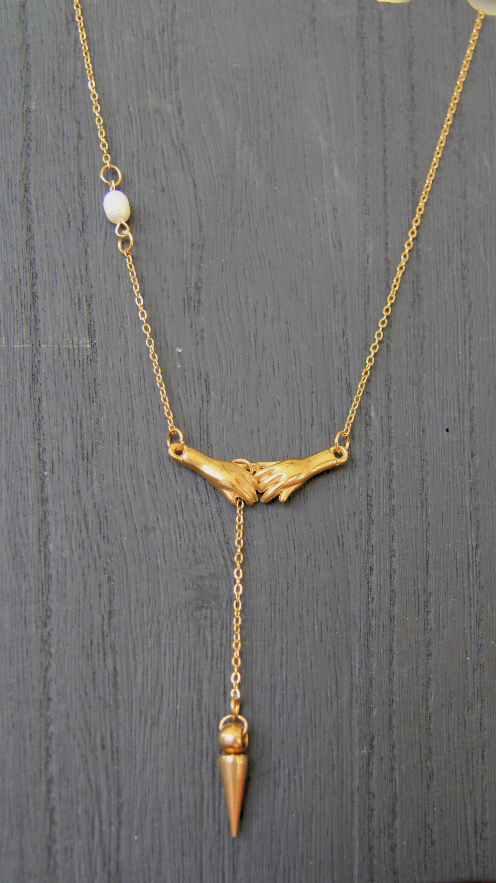 With golden gloves, a rotten spike, and a touch of elegance and glamor, the Auren necklace tells the story of its namesake with pride. This FMC goes to hell and back and exemplifies the phrase "feel sh!tty, look pretty" throughout her journey. 18k gold PVD plated stainless steel and genuine pearl. Water and tarnish proof.