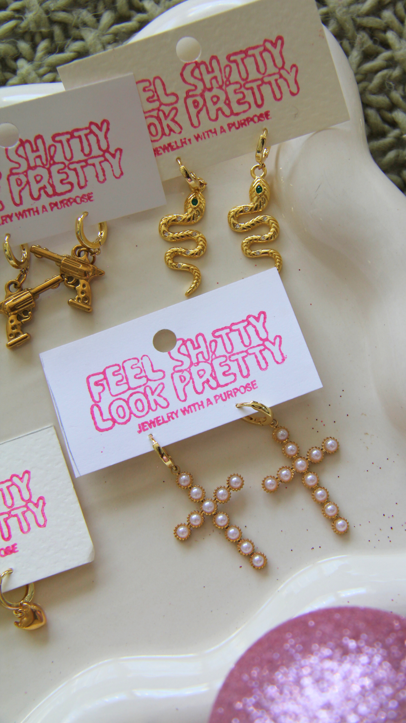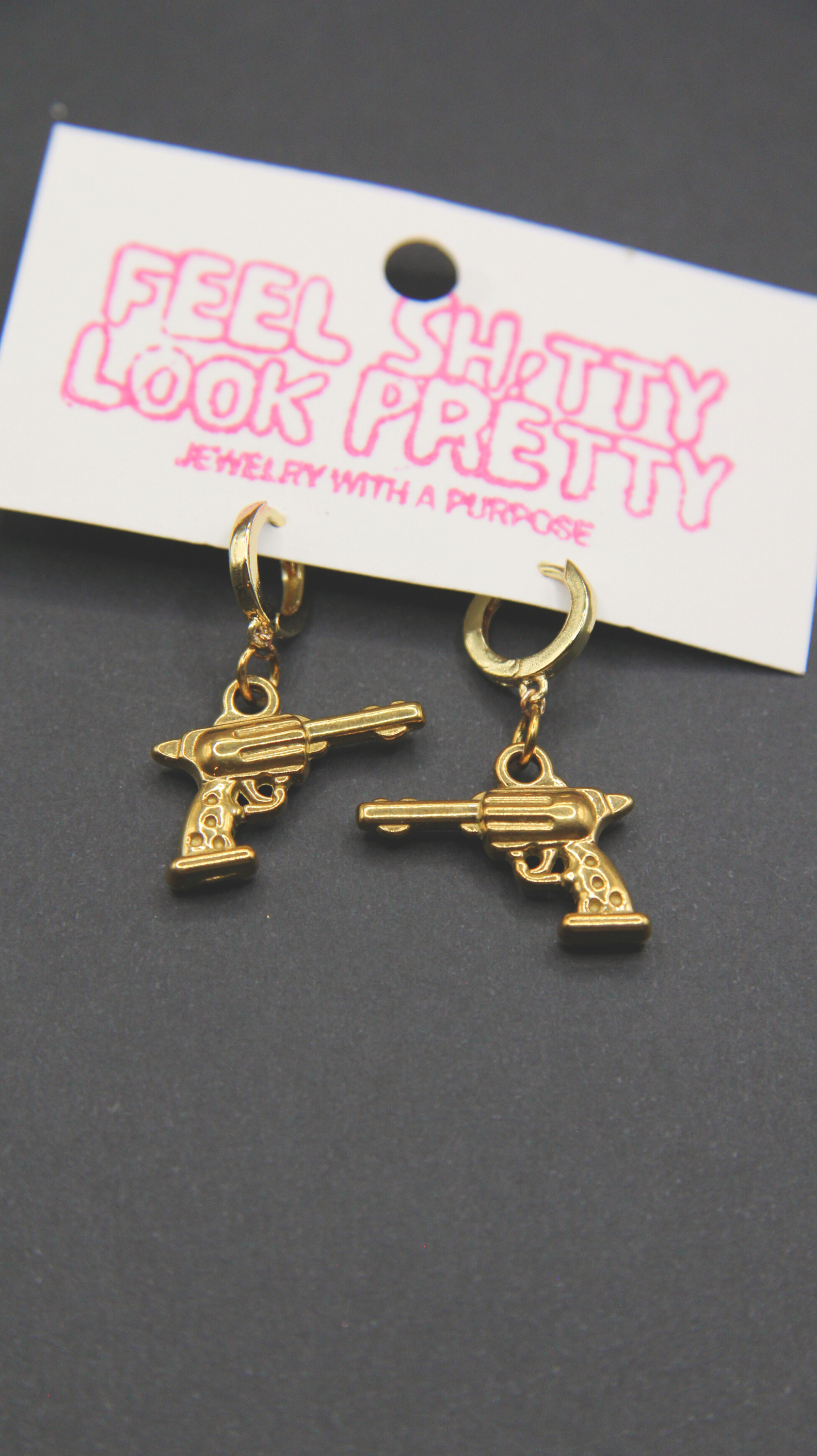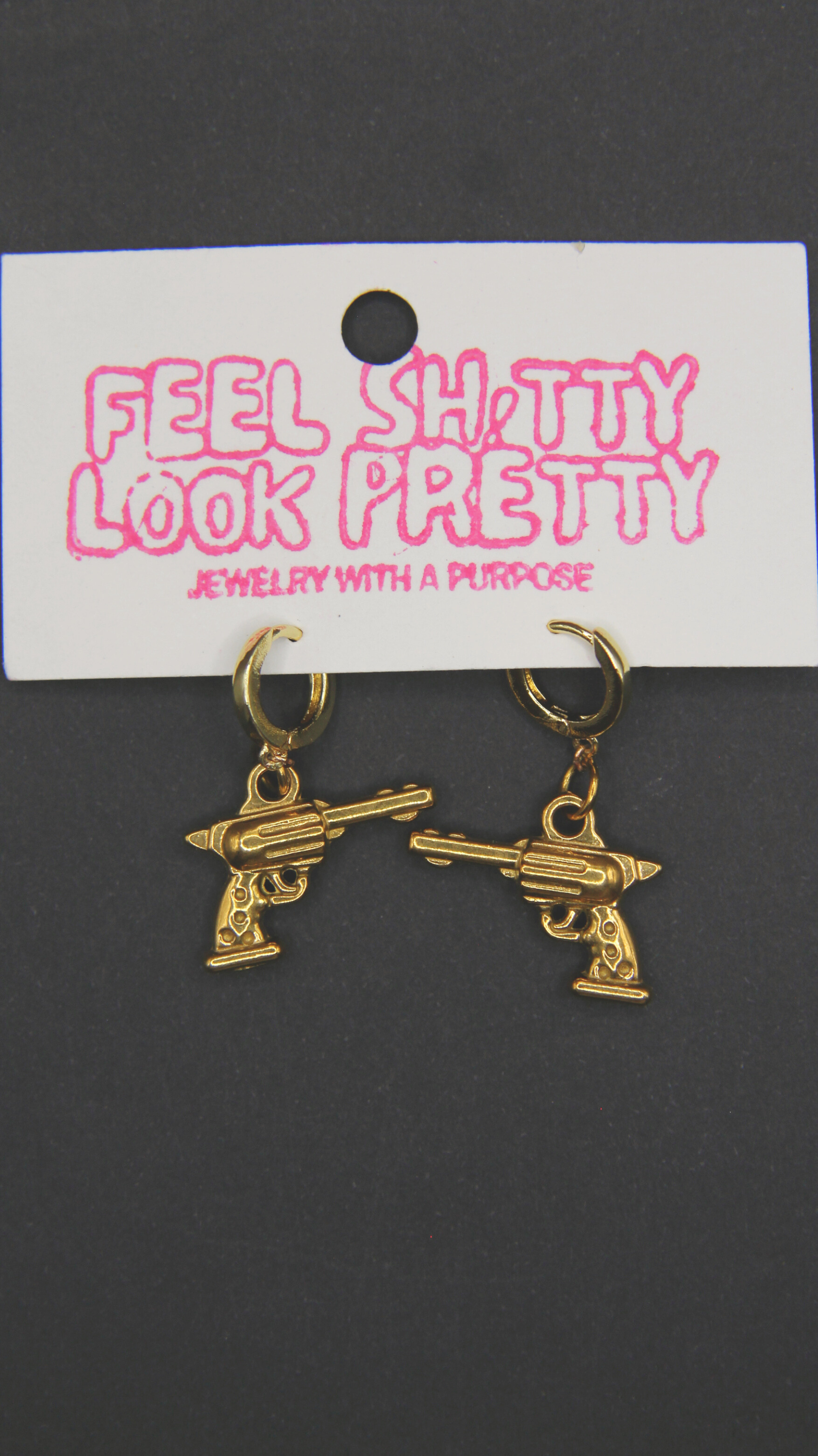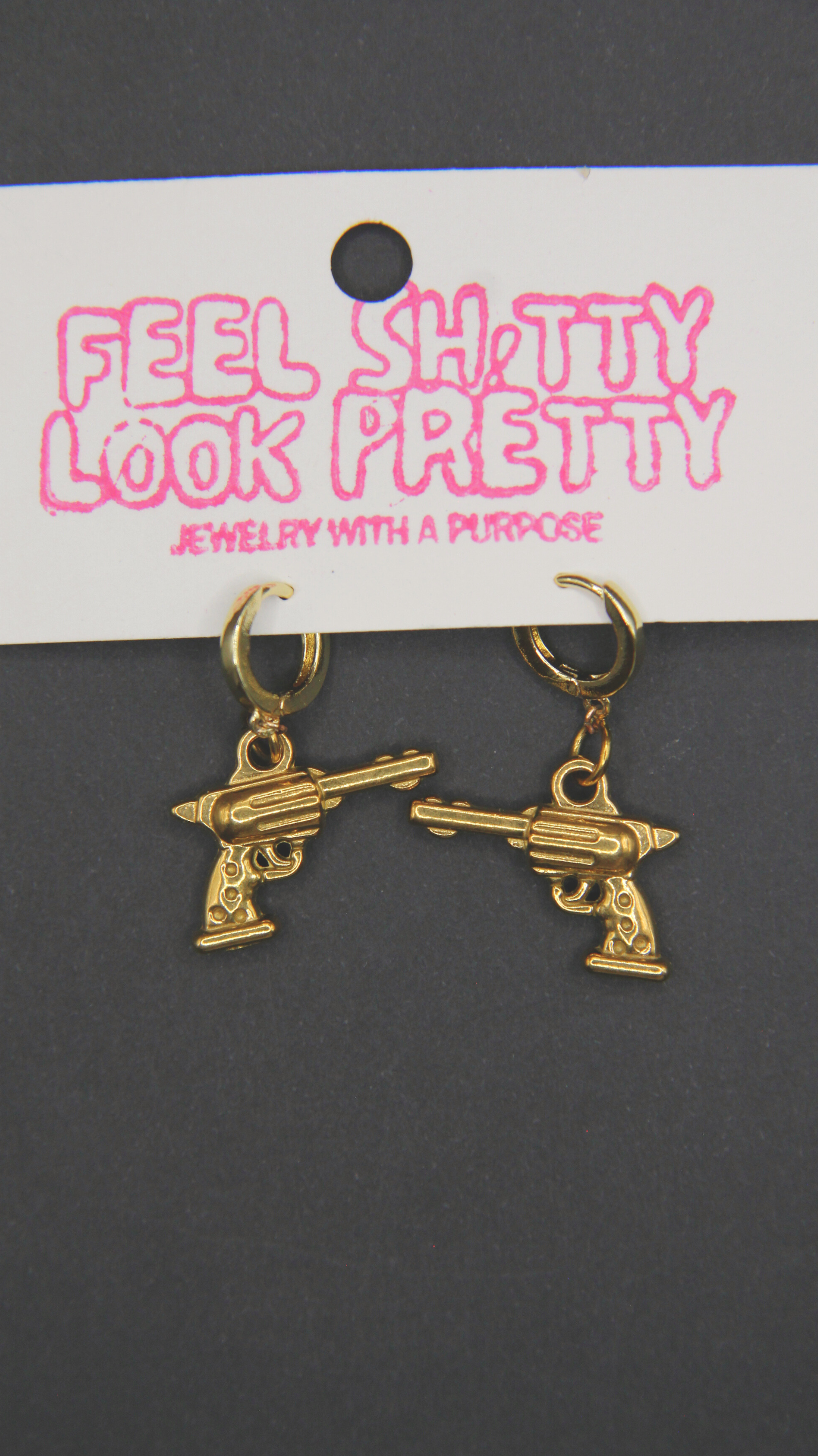 18k gold PVD plated stainless steel gun huggie earrings. Water and tarnish proof!