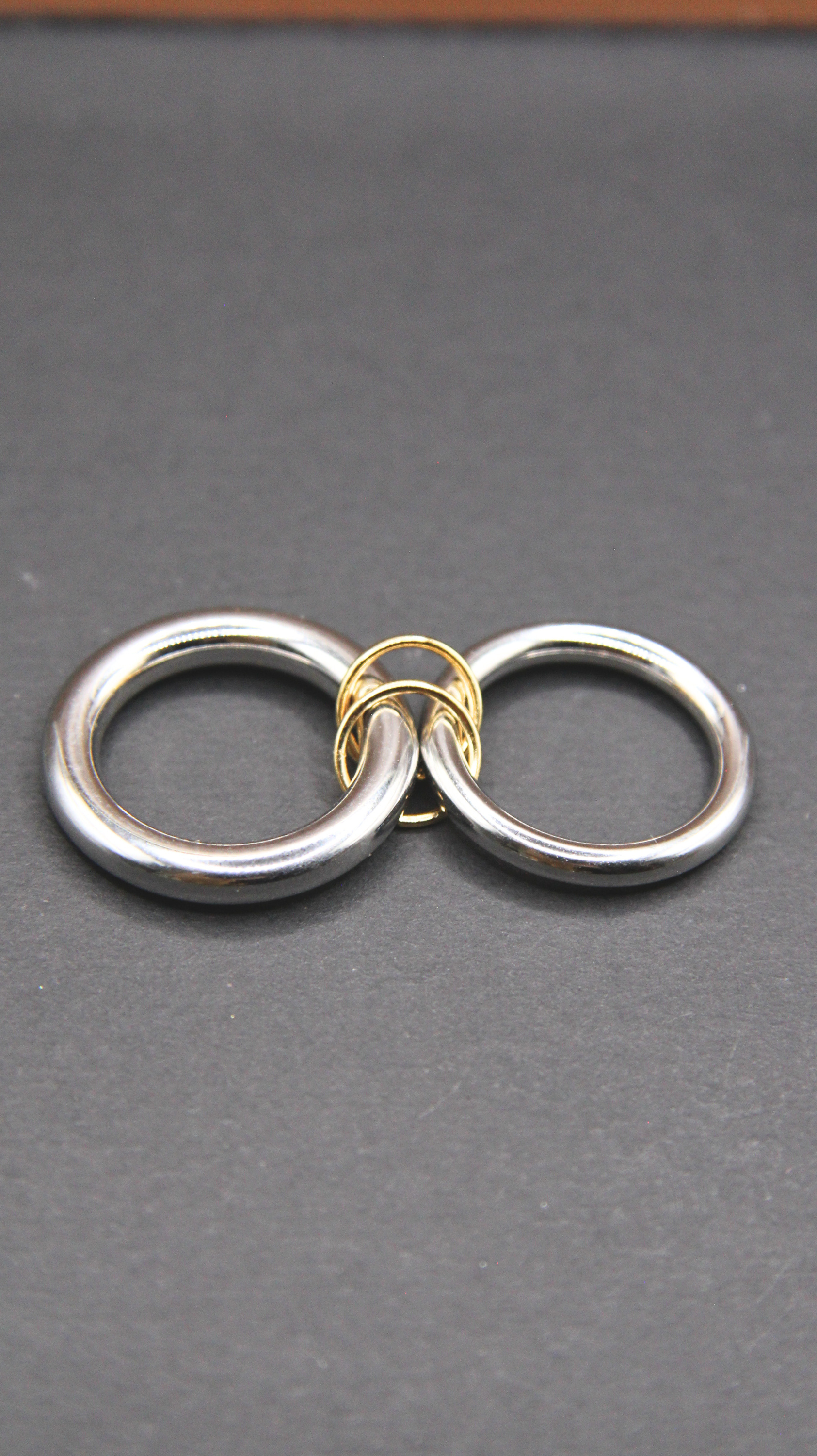 This gorgeous ring is made up of two silver rounded band rings, one slightly larger than the other, connected by two small gold rings to create a paired stack. 18k Gold PVD plated stainless steel and shiny silver stainless steel. Water and tarnish proof.