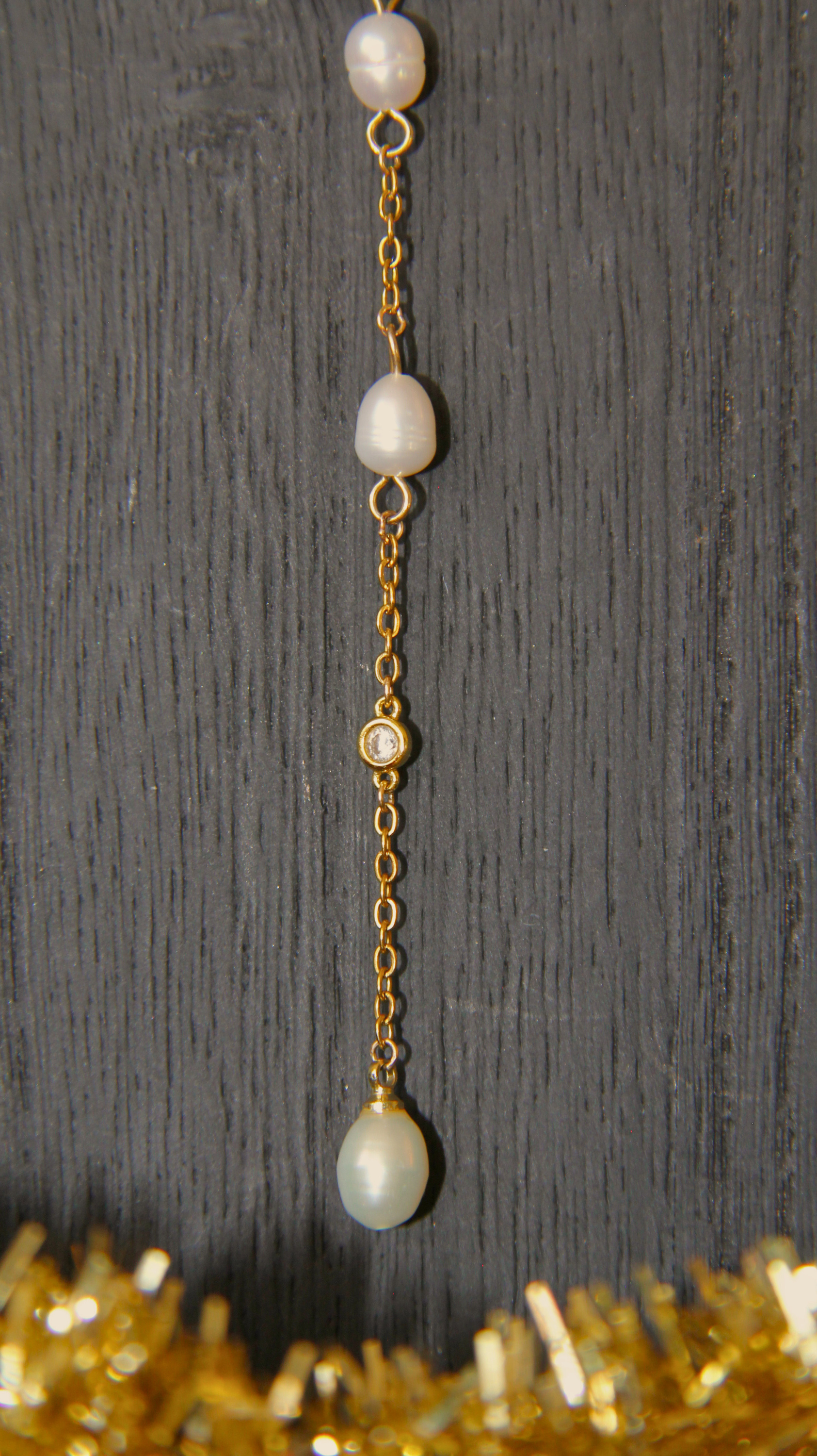 18k gold PVD plated stainless steel with genuine pearls and a sparkling bezel-set cubic zirconia. Water and tarnish proof.