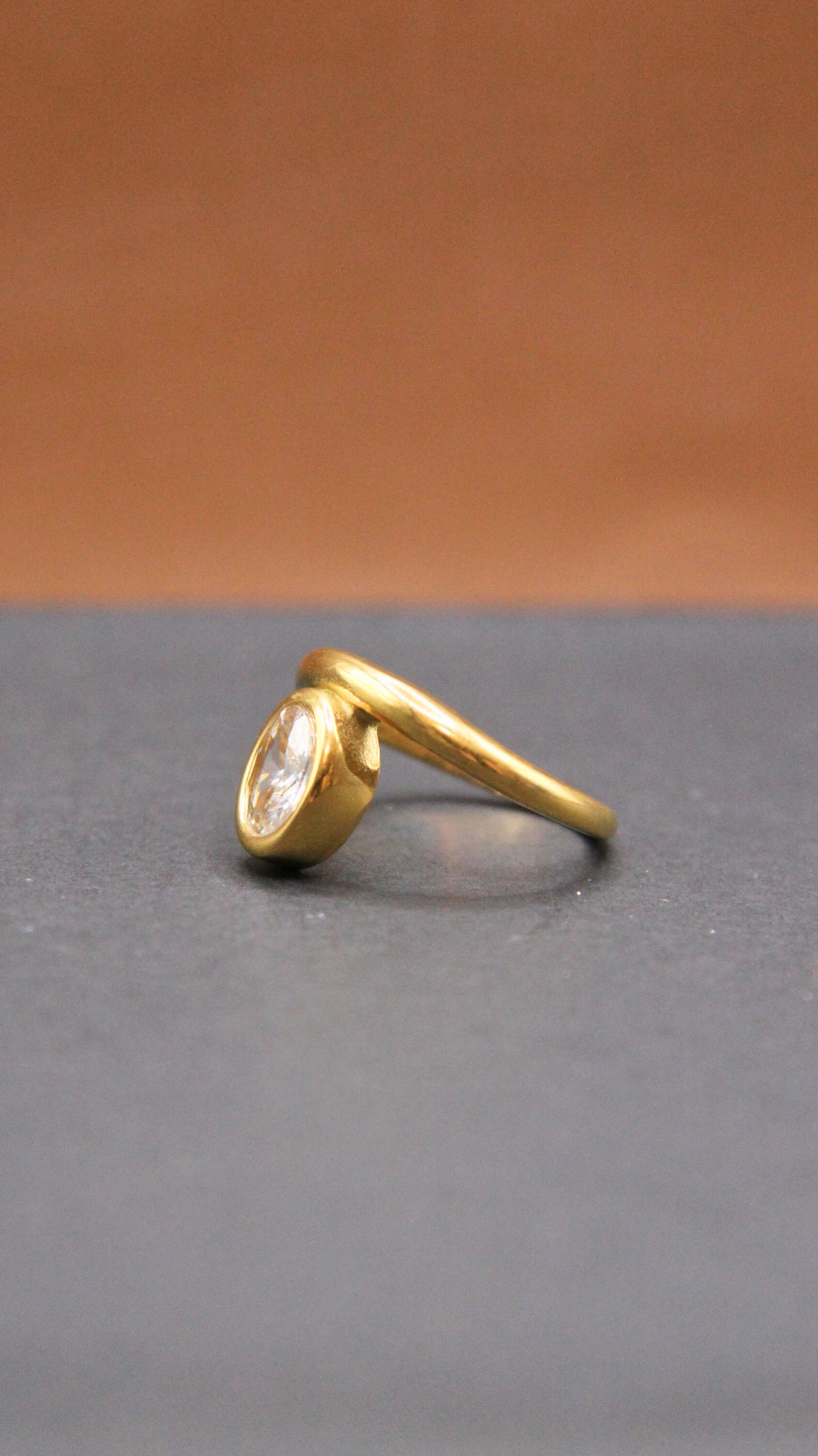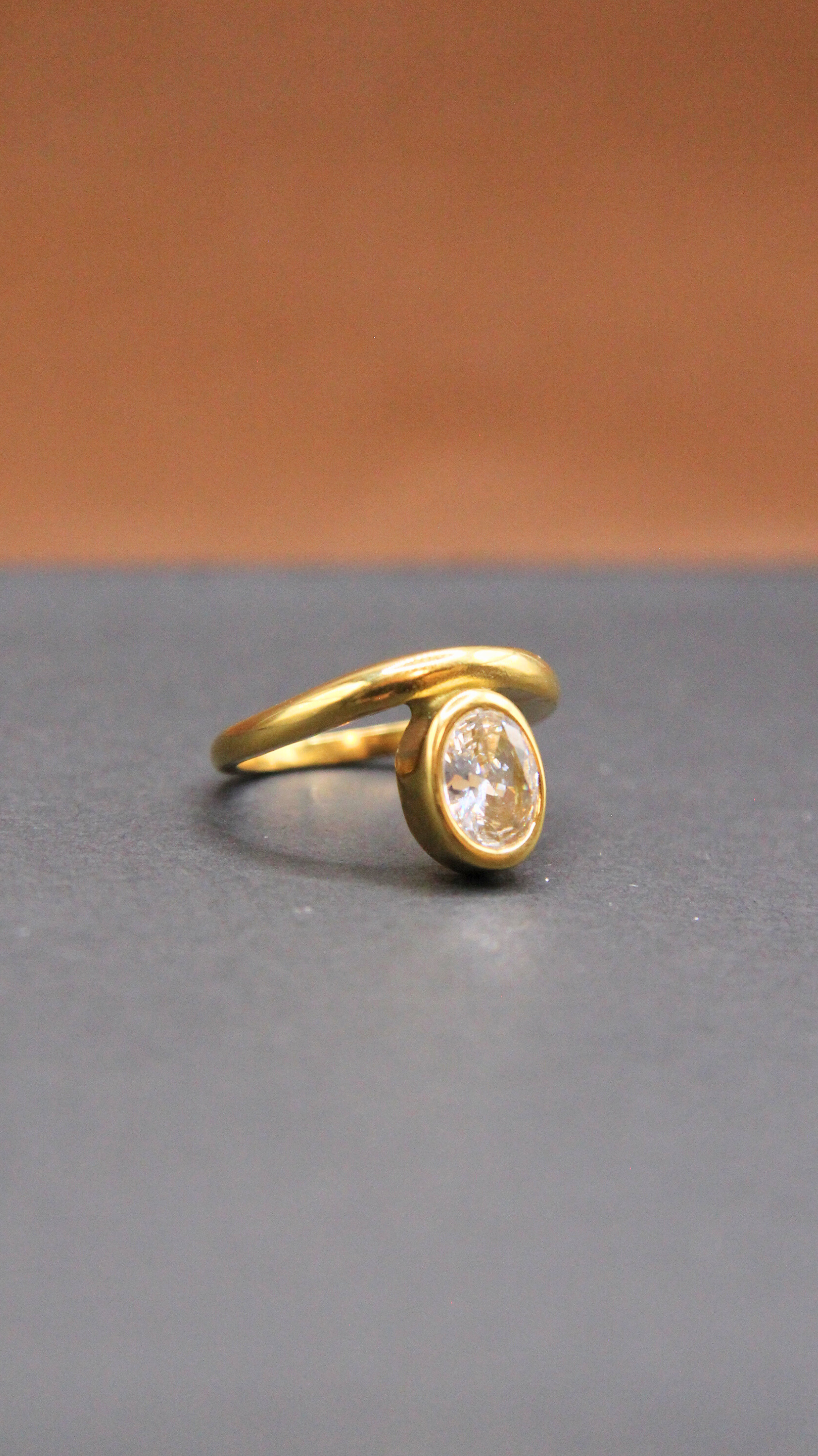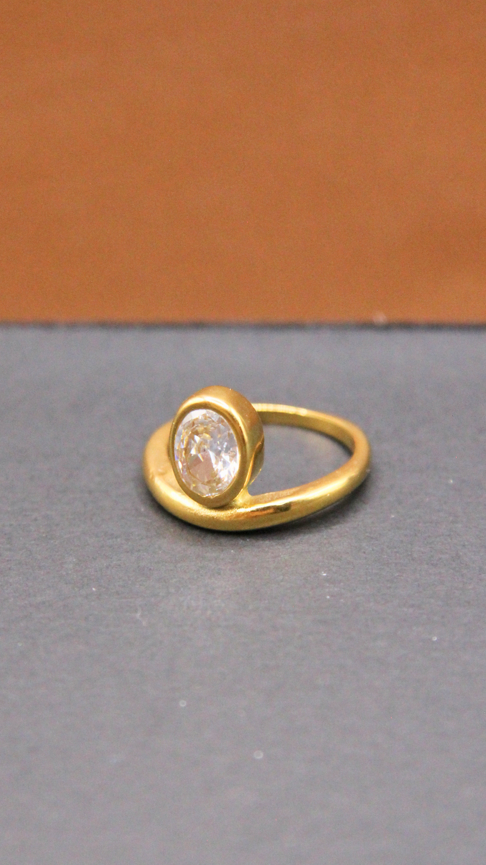 The Gabrielle ring is a stunning solitaire crystal, bezel set in an oval shape with a curved band. Great for stacking or worn alone! 18k Gold PVD plated stainless steel. Water and tarnish proof!