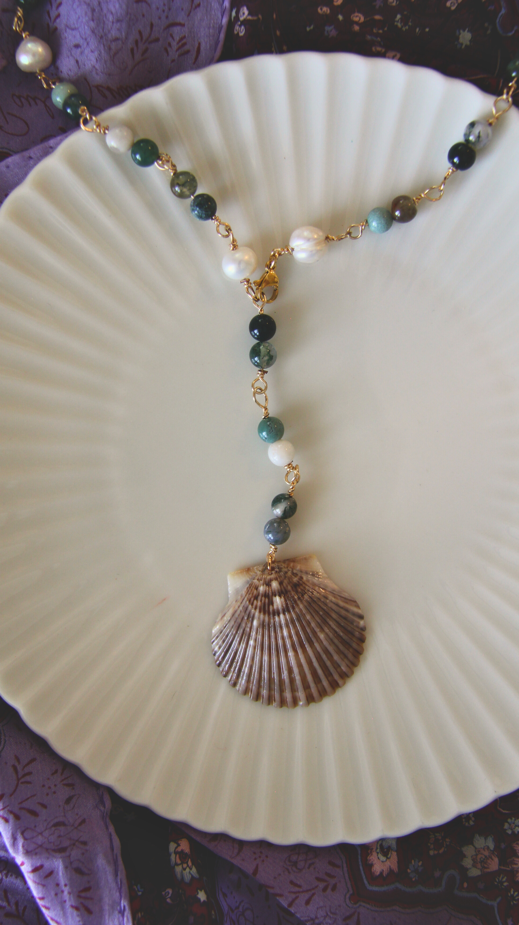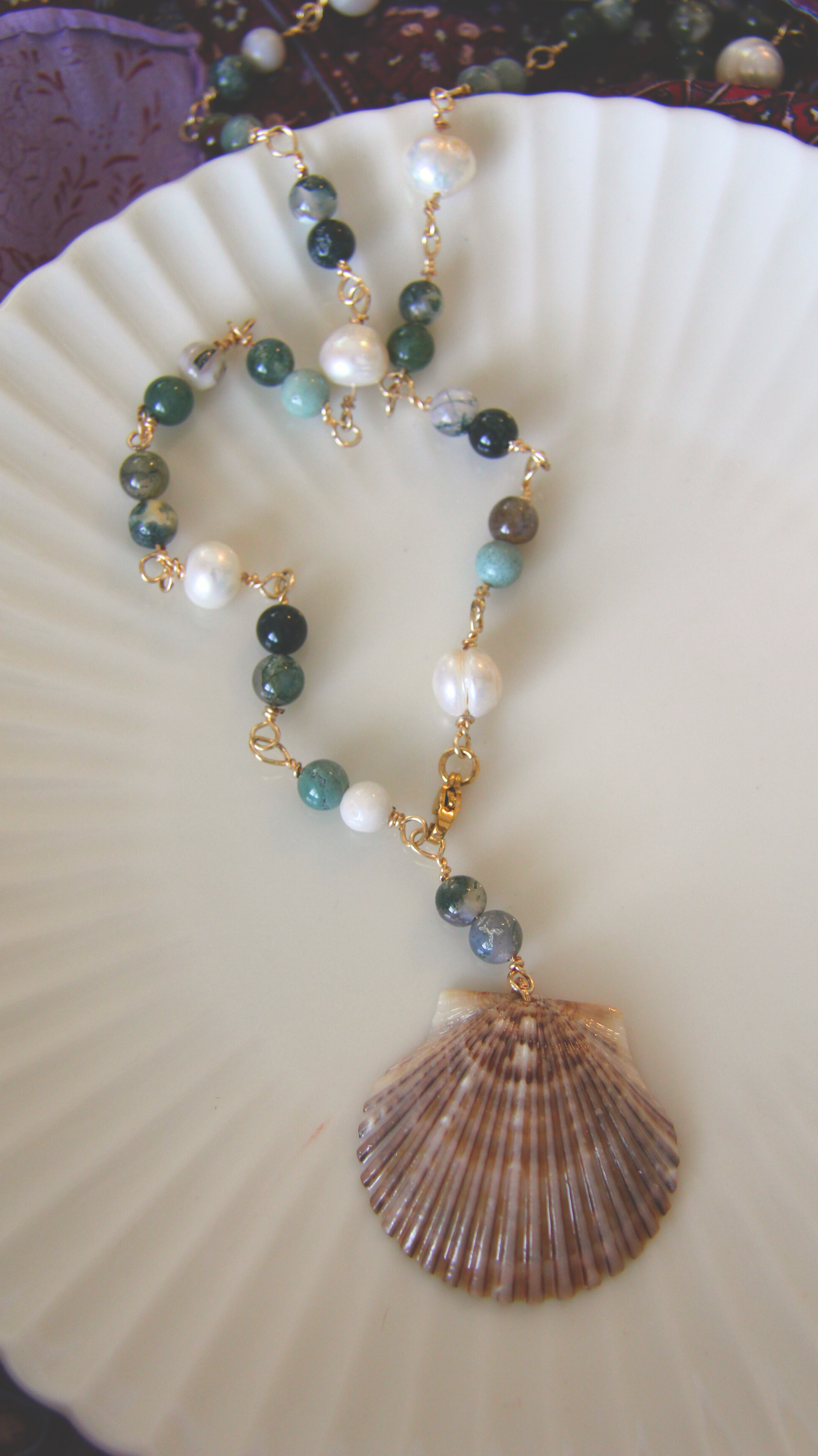 Genuine green tourmaline and pearl beads, wire wrapped with allergen-friendly gold plated wire. The circle in the center opens up so you can remove the shell charm and replace it with a charm of your choosing!