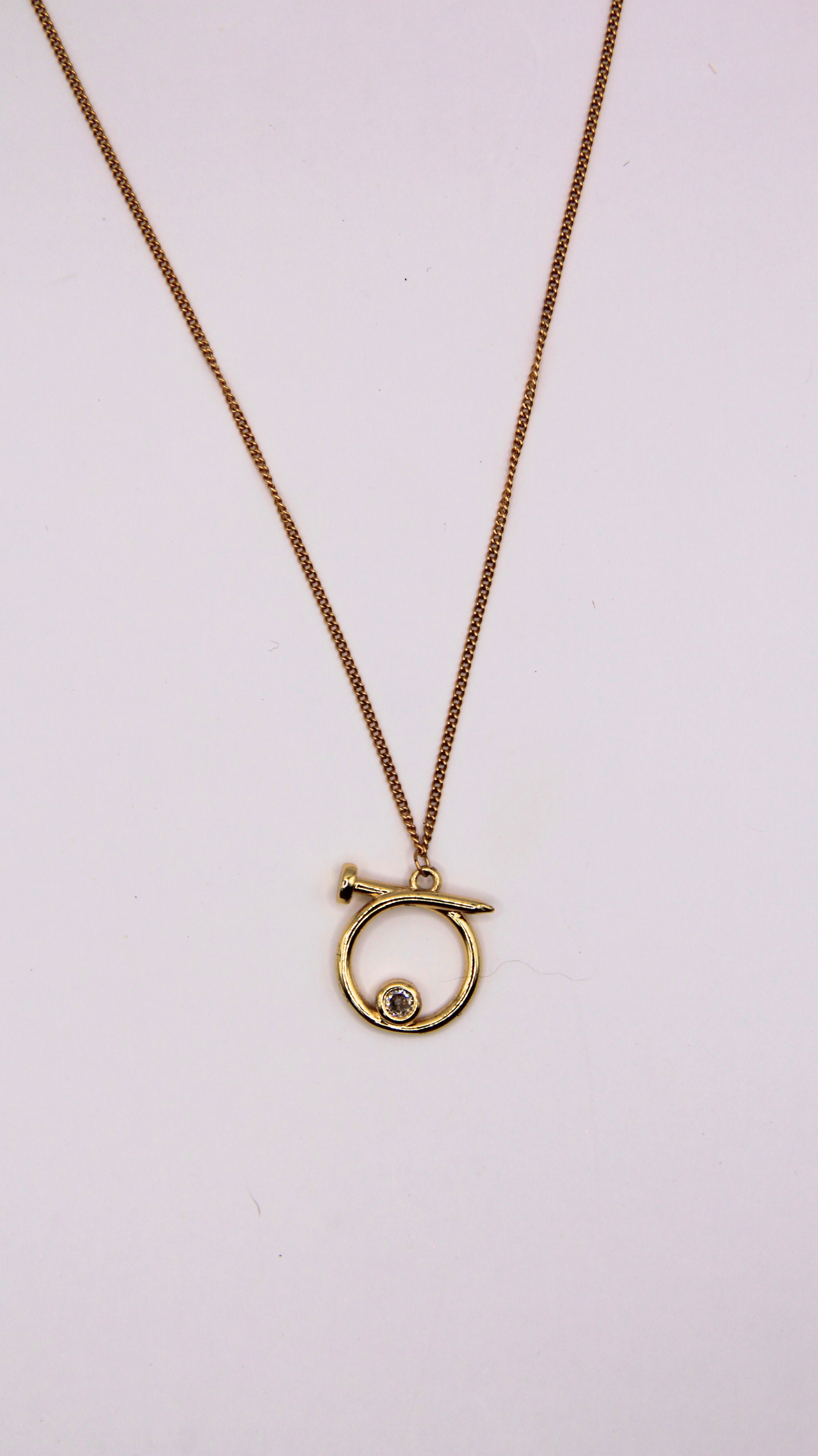 The nail is a staple in their collection, but it is featured here as a pendant with a sparkling crystal in the center. The pendant hangs from the classic light catching cable chain, which exudes timeless elegance.