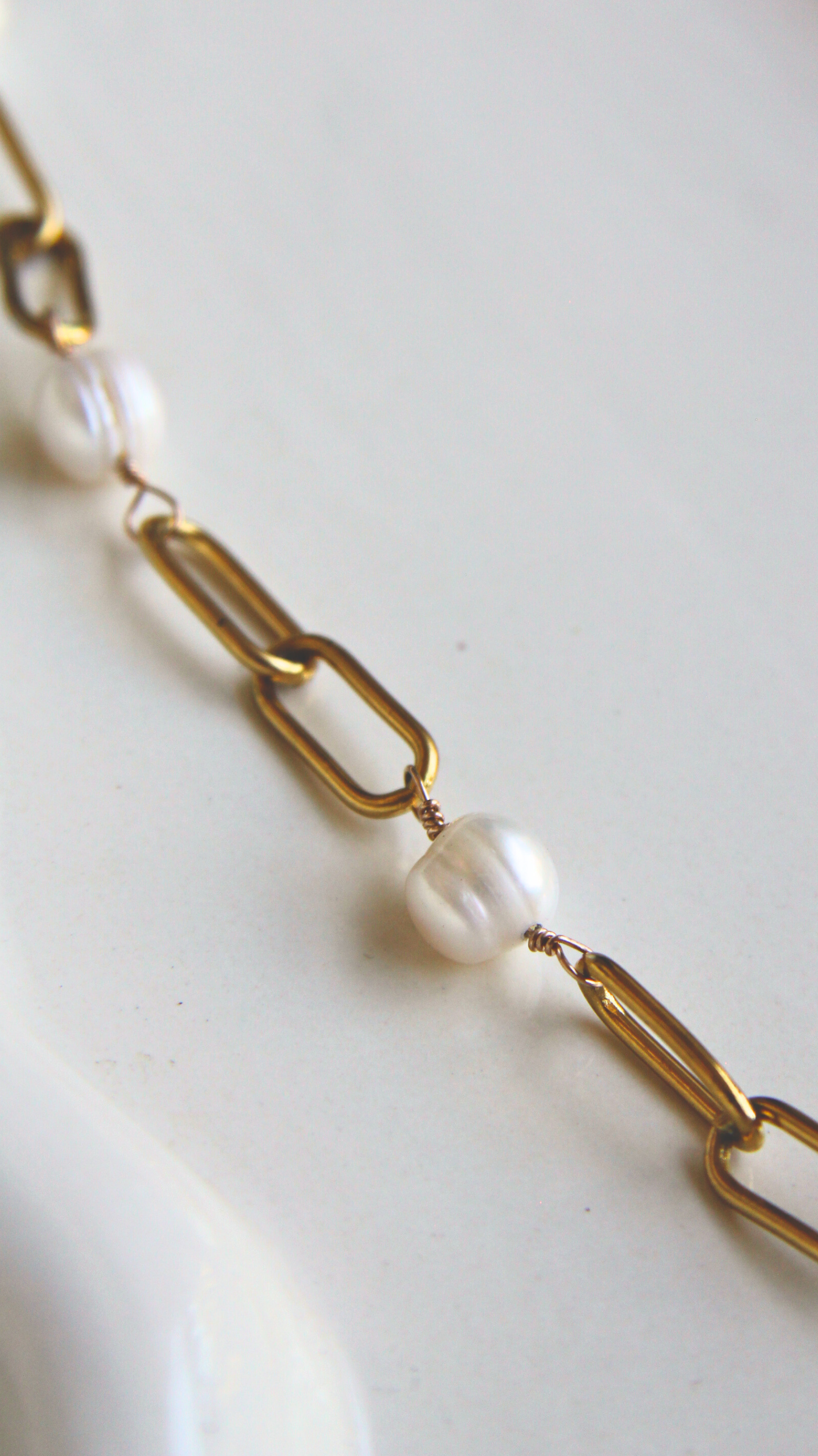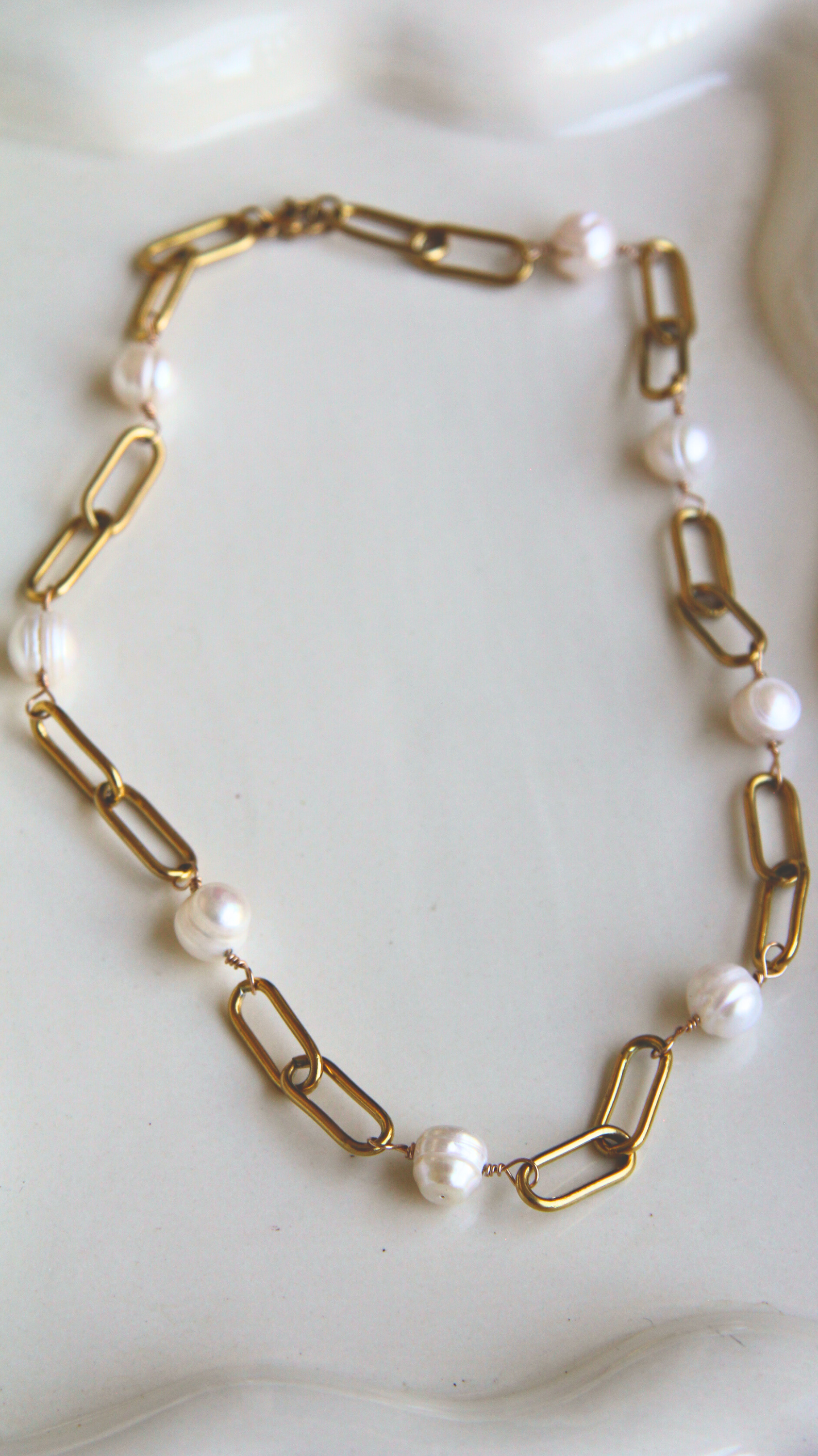 18k gold pvd plated stainless steel paperclip chain with genuine pearls and 14k gold filled wire. Water and tarnish proof.