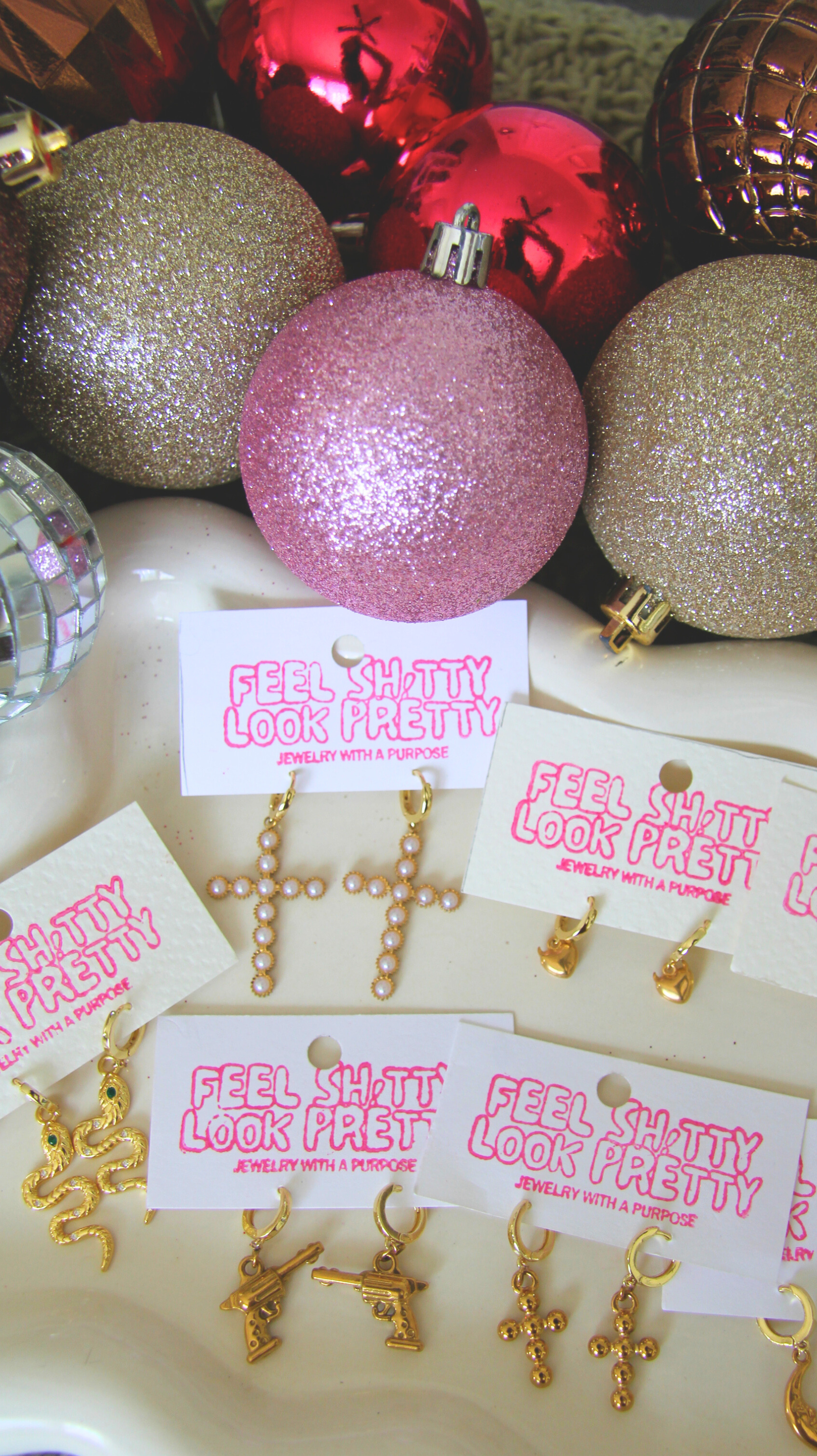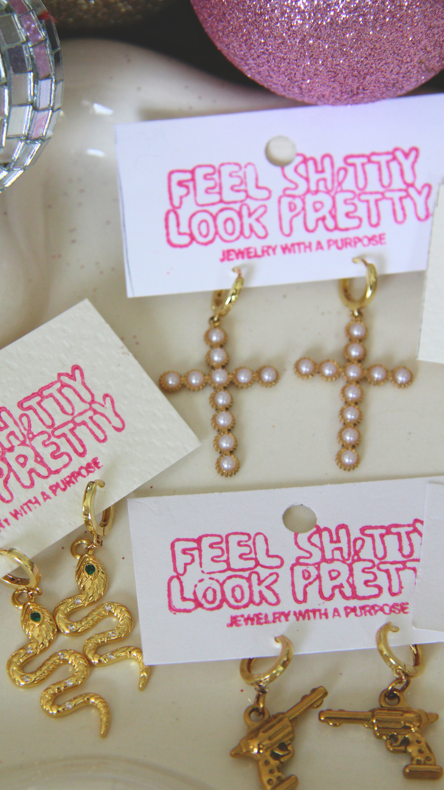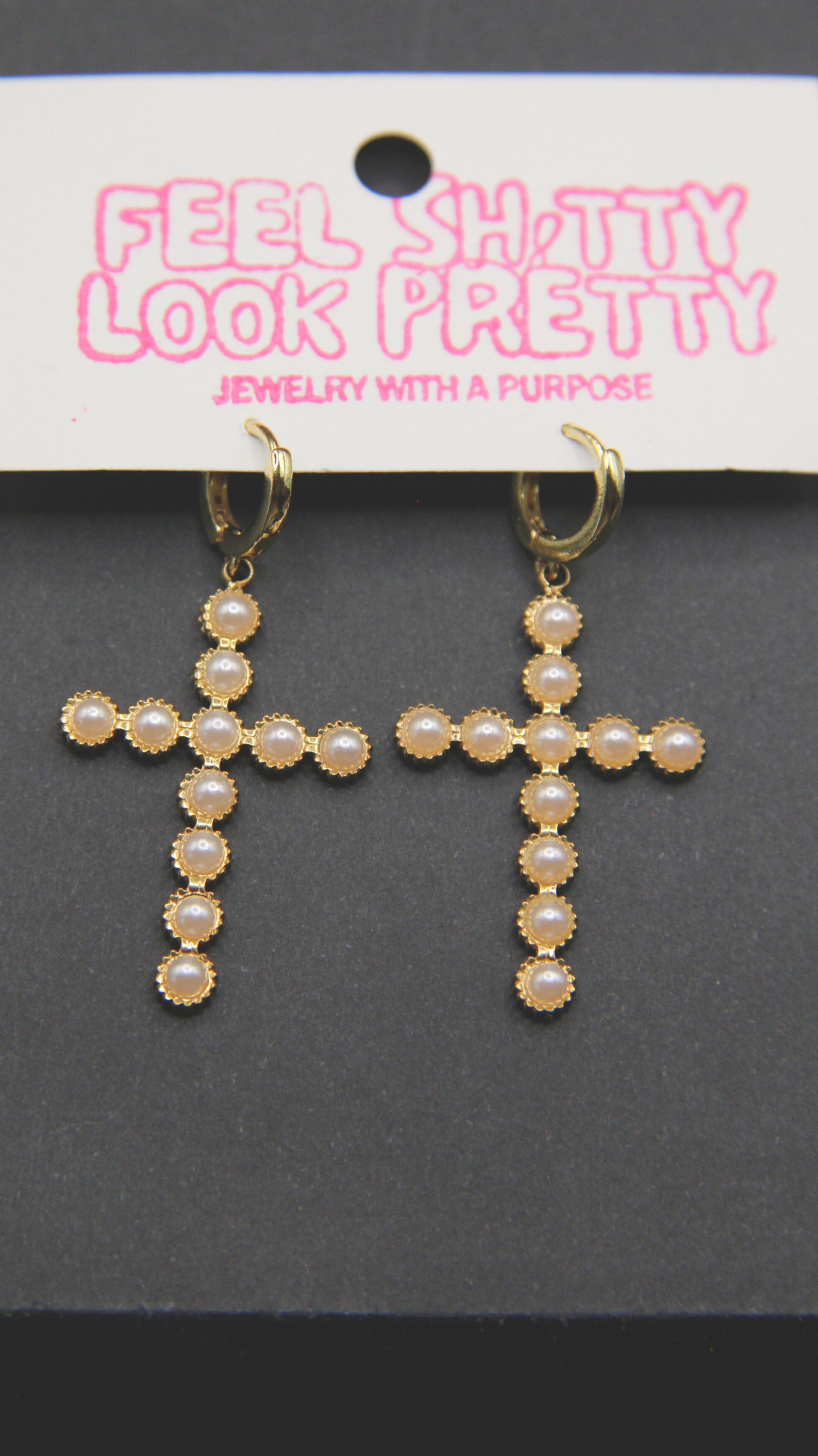 18k gold pvd plated stainless steel with imitation pearls. Water and tarnish resistant.