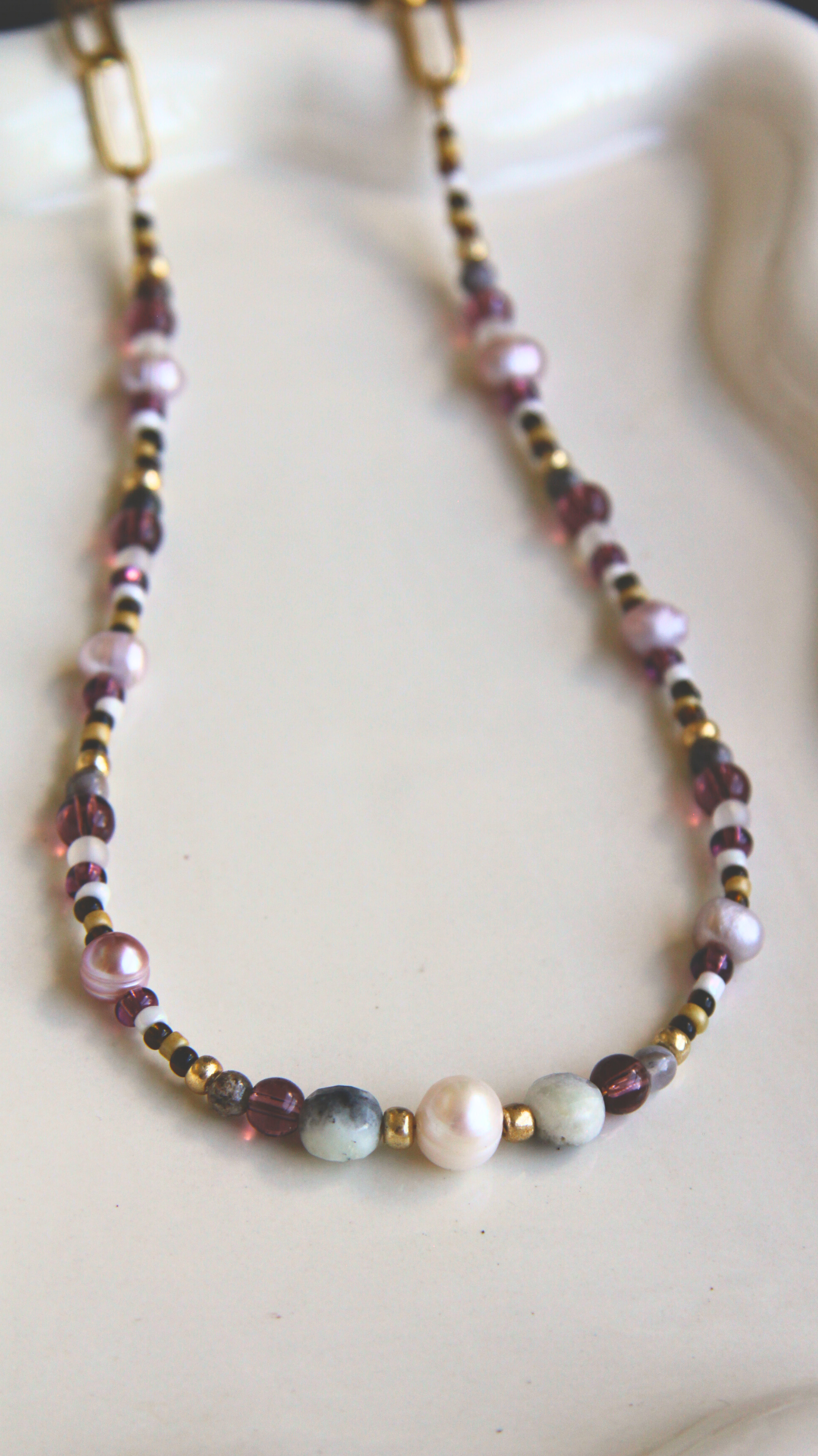 Glass beads, genuine pearl, and genuine faceted labradorite beads. Finished with 18k gold pvd plated stainless steel paperclip chain. Water and tarnish proof!