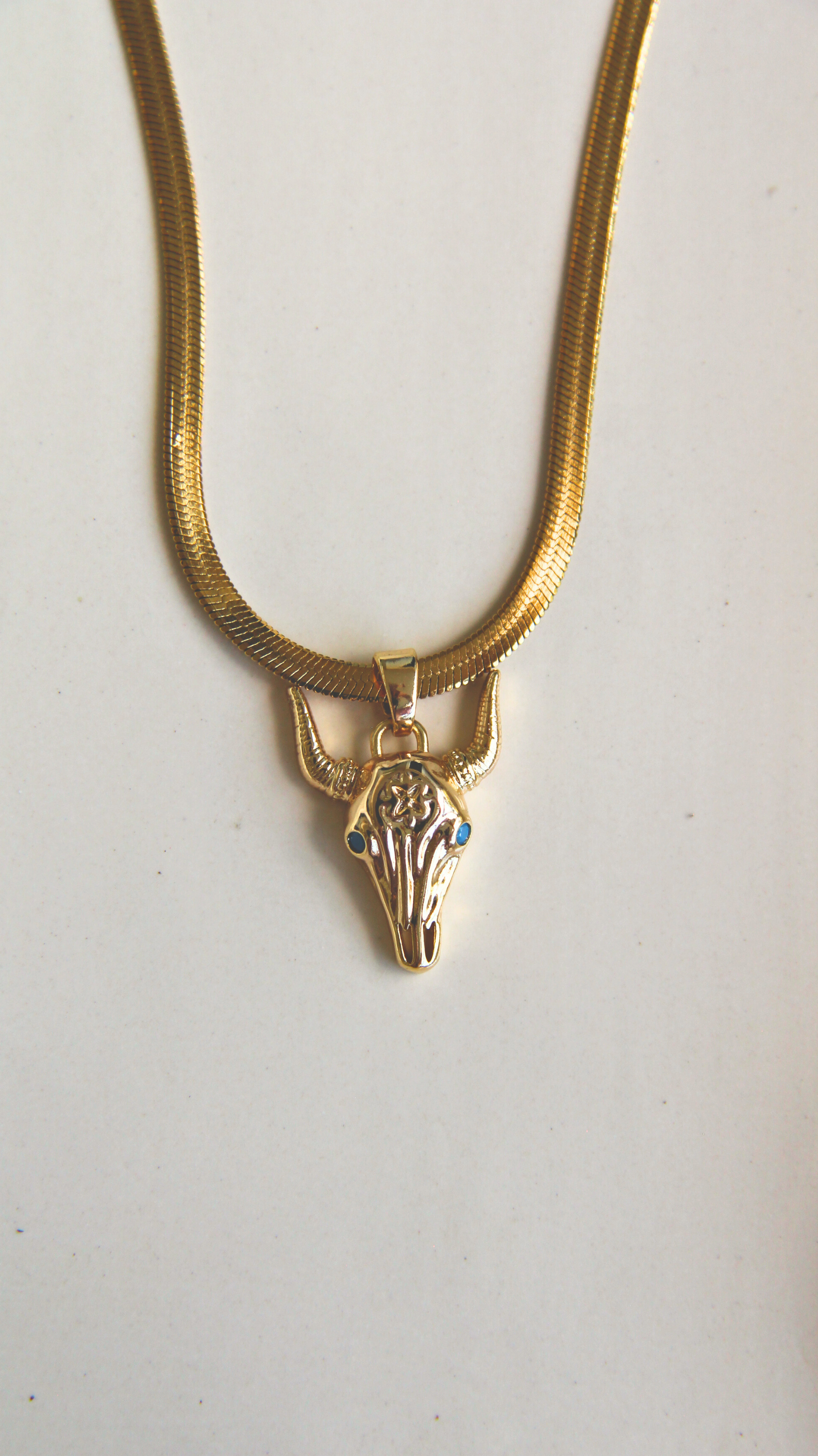 18k gold PVD plated flattened snake chain and turquoise-eyed bull head charm.